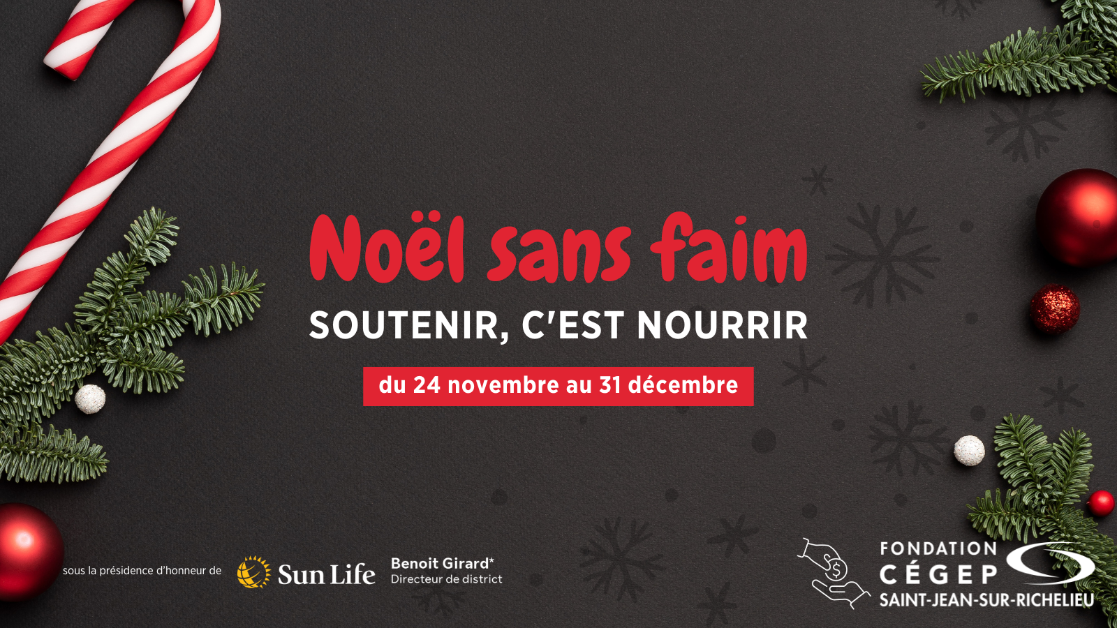 La Fondation du Cégep Saint-Jean-sur-Richelieu soutient les étudiant·es en situation financière précaire grâce à la campagne Noël sans faim, qui cette année est sous la présidence d'honneur de Benoit Girard - Sun life. Vos dons permettront de remettre des bons d’épicerie pour le temps des fêtes et contribueront à l’aide alimentaire tout au long de l’année.