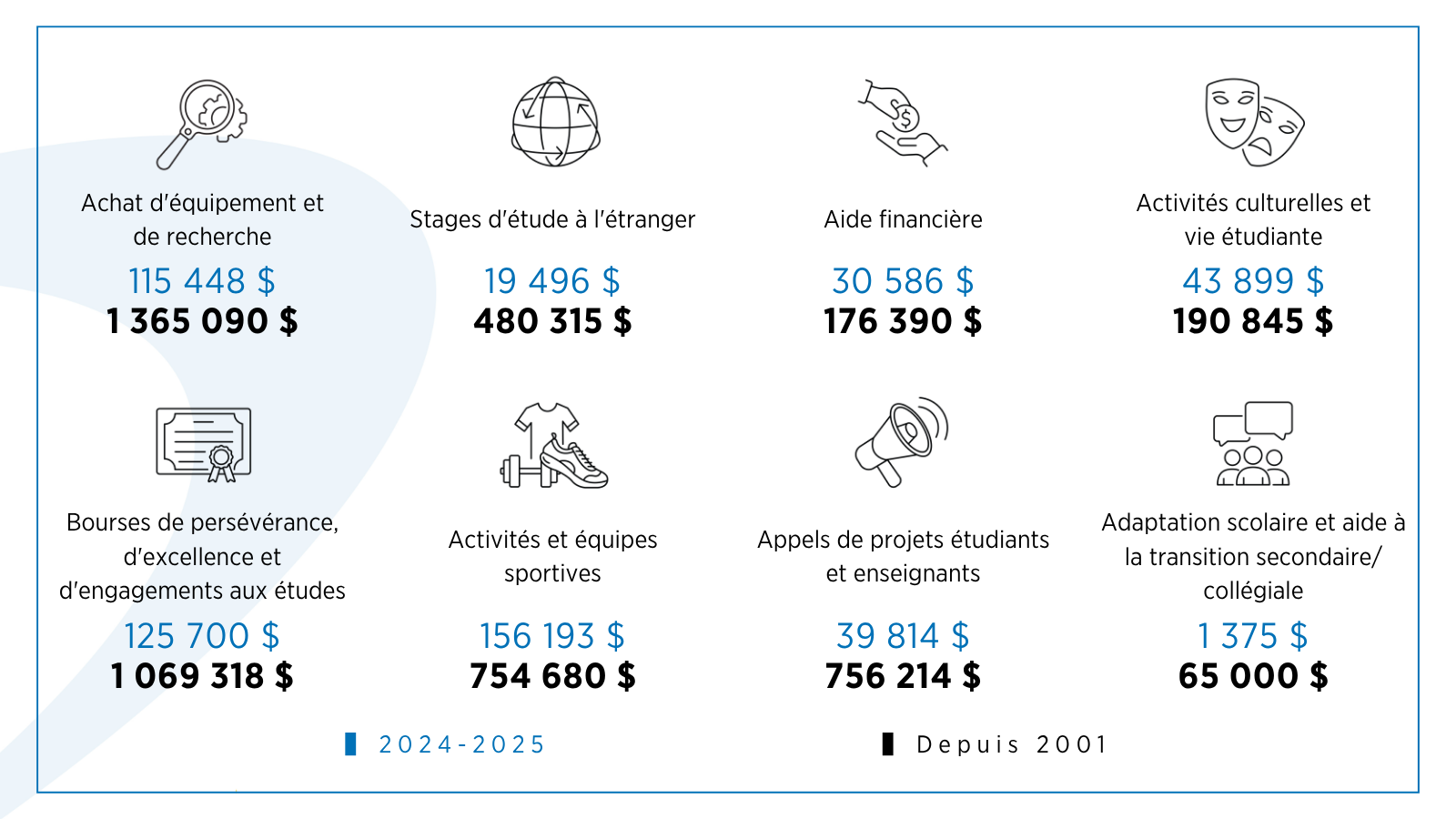 Depuis 2001, plus de 4 857 000 $ ont été investis auprès de la communauté collégiale du Cégep Saint-Jean notamment pour :