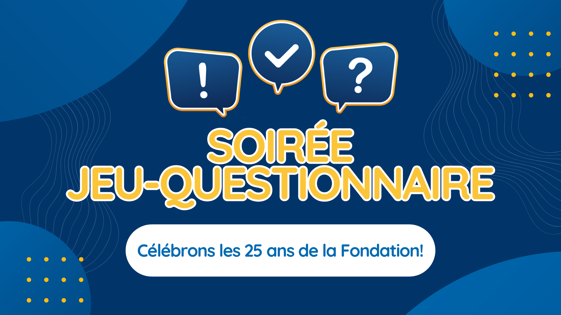 Dans le cadre de son 25e anniversaire, la Fondation tiendra une série de six jeux-questionnaires de connaissances générales. Les rencontres auront lieu au Randolph Pub Ludique du Quartier DIX30 chaque troisième mercredi du mois, de janvier à juin 2026. Ces activités offriront aux participants l’occasion de se rassembler dans un contexte convivial et de tester leurs connaissances sur une variété de thèmes. Cette programmation s’inscrit dans les célébrations entourant le quart de siècle d’action de la Fondation et propose une façon originale de marquer cette étape importante de son histoire.